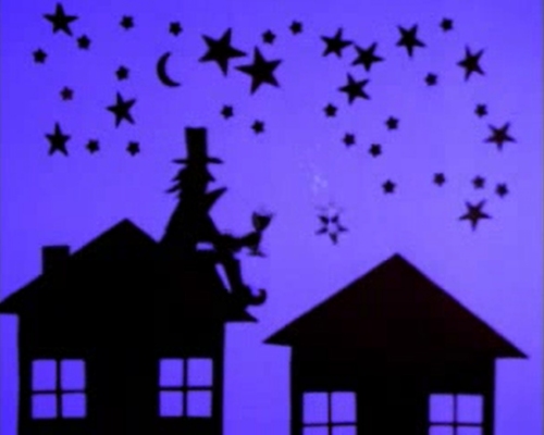 nesneler ve karakterler için siyah karton kullanıldı. Arka fonun rengi bilgisayar ortamında verildi. Gökten düşen bir