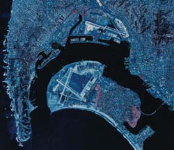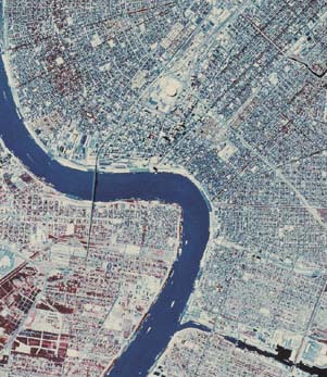 This unique aerial view, created by a combination of wavelengths, gives