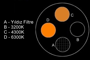 4 numaralı filtre konumunda 2 numaralı filtre gibi güneş ışığının 5600 Kelvin